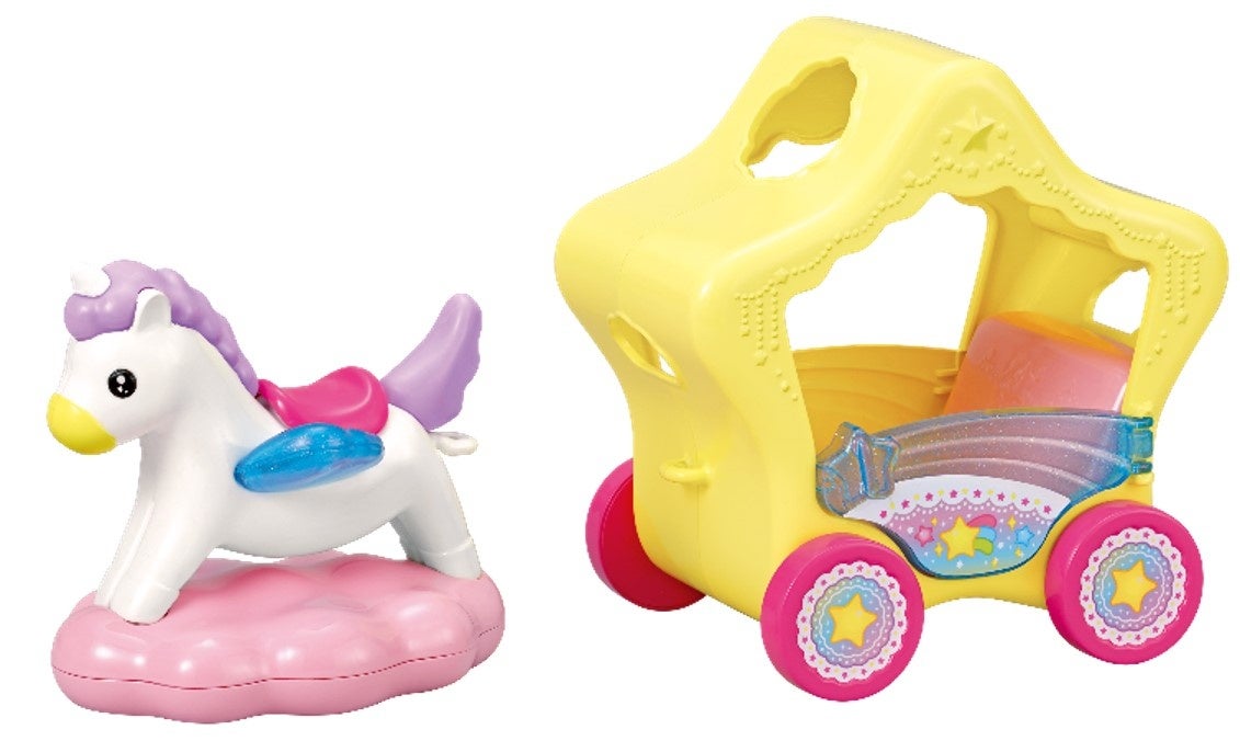 ユニコーンと馬車を連結してコロコロと進むことができる「おほしさまの馬車」は、くものうえの★ポケメルキャッスルと合わせることで、さらに遊びが広がります。「にじいろドレス&タキシードセット」は、きらきら輝くカラフルなドレスとタキシードのセットで、ポケットメルちゃんやおともだちに着せ替えをして楽しむことができます。