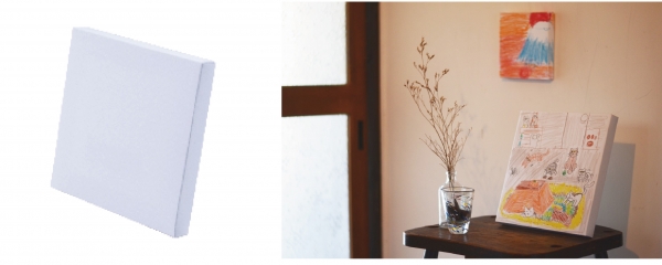 「紙製組み立てキャンバス」は、画用紙やスケッチブックと同じように机の上で描いた後に、立体に組み立てて飾るキャンバスです。ハサミやのりを使わず、台紙をミシン目で切り取って組み立てられます。飾らないときは、平らに戻すことで省スペースに収納・整理できます。