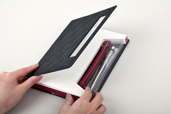 表紙に透明な窓をつくることによって、従来の形状を保ちながらも今までにない斬新な形状となっている。