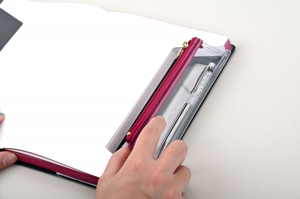 既存製品ではペンを側面に差し込むもの、ペンホルダーを装着させるものなど、ノートからはみ出てしまうものが多い。そこで、表紙の内側にポシェットを格納することで、スマートなデザインを目指した。