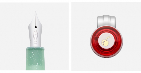 The 14k gold nib, which provides smooth writing, is engraved with a motif of Melon soda float, and clear red cap top is decorated with a cherry.