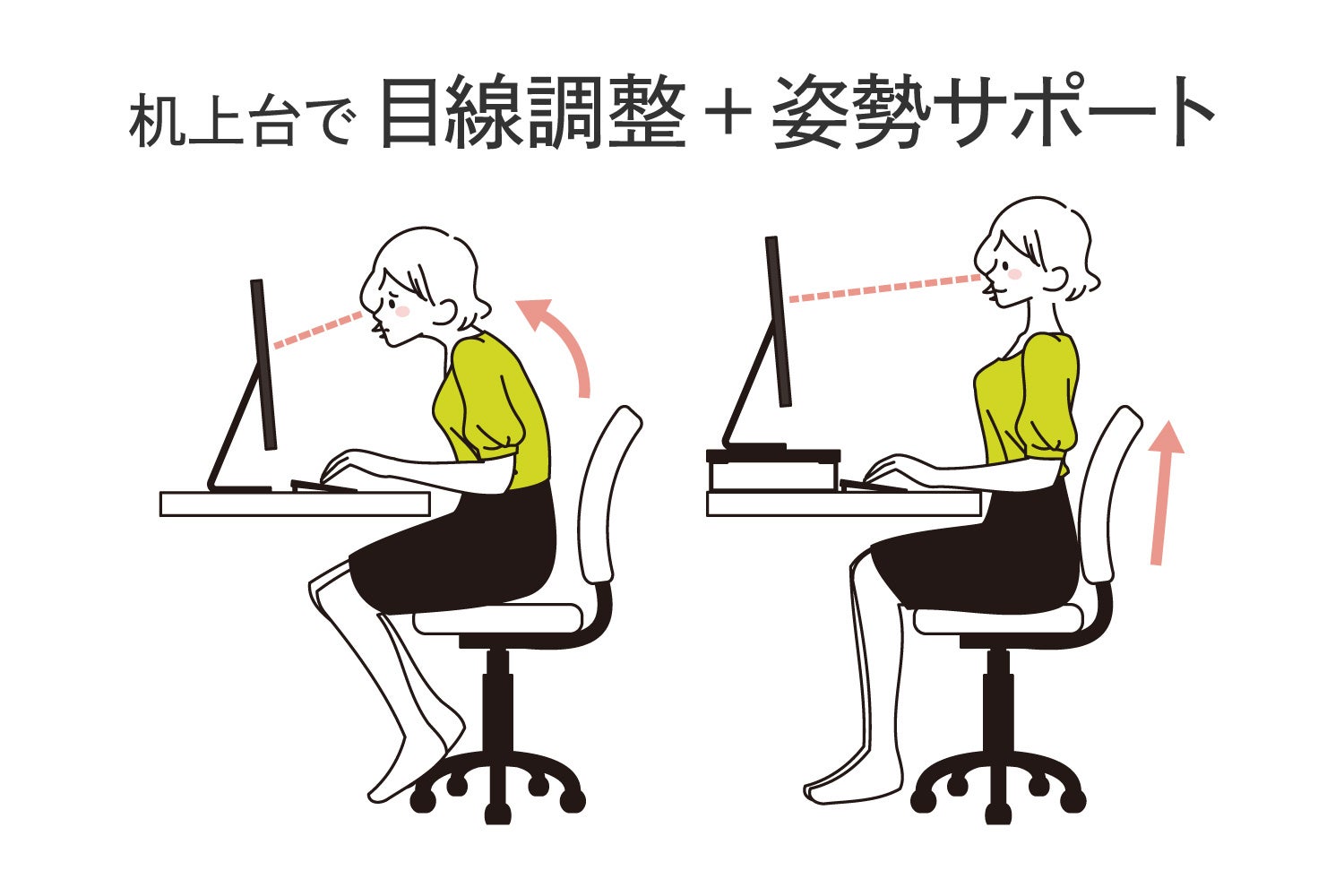 「机の上がすっきり、スペースの有効活用」「目線調整+姿勢サポート」