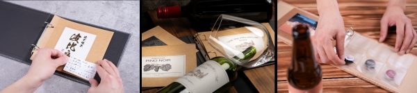 ラベルはがしシートを使って、時間をかけずにラベルを簡単にファイリング可能。コレクションの入れ替えや整理がしやすいリフィールタイプです。「乾杯セット」は専用バインダー、ラベルはがしシート6枚、台紙3枚がセットになったスターターセット。クラフトビール用には、王冠も一緒に収納できるリフィール付きです。ワイン用バインダーは、PUレザーに型押しロゴを施した高級感溢れる仕様に。コルク風に仕上げたクラフトビール用バインダーは、彫刻ロゴ入りです。また、追加用リフィールの「ほろ酔いセット」もご用意。ご自宅でのお酒ライフがさらに楽しくなるようなコレクションアルバムです。