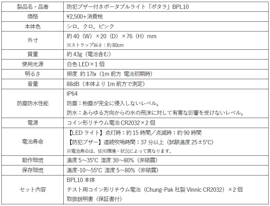 製品名・品番:防犯ブザー付きポータブルライト「ポタラ」BPL10