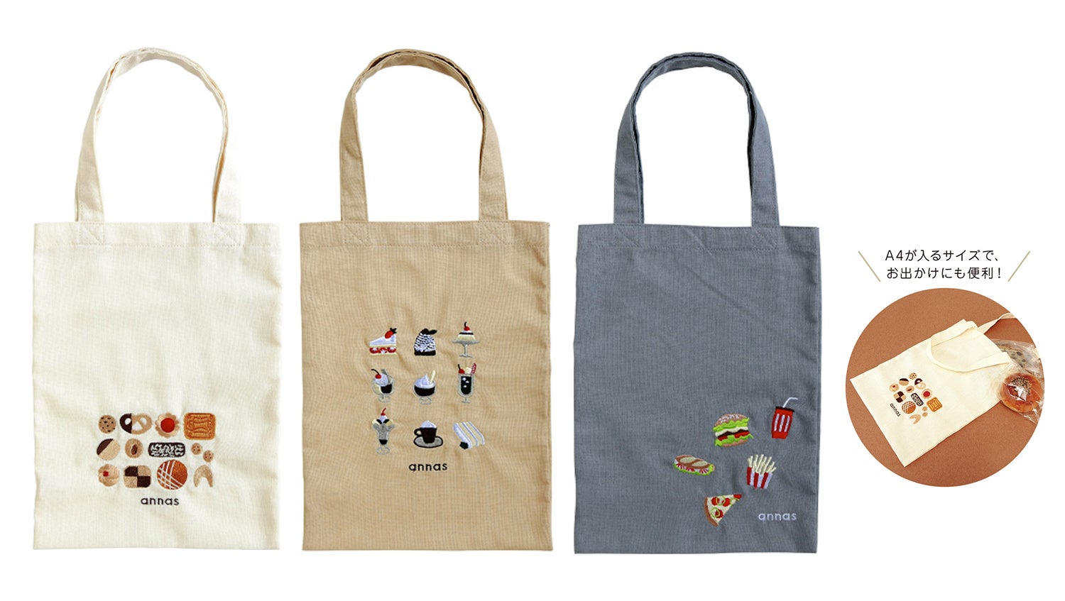 刺繍作家annasさんの著書「annasのおいしい刺繍CAFE&SWEETS」(光文社)より、様々な種類のパンやスイーツ、ドリンクなどカフェをモチーフにした刺繍を使って、大人かわいいデザインに仕上げています。