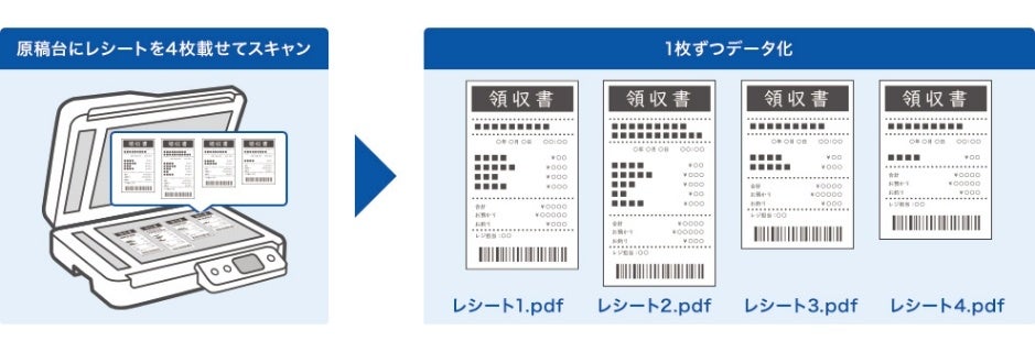 エプソン初搭載の原稿台の複数枚切り出し機能により、原稿台に名刺や領収書などを複数枚セットして読み取ると、それぞれの原稿を1枚ずつ元のサイズ通りにデータ化して保存することができます。これにより後からトリミングする必要がなくスキャン作業を効率化します。