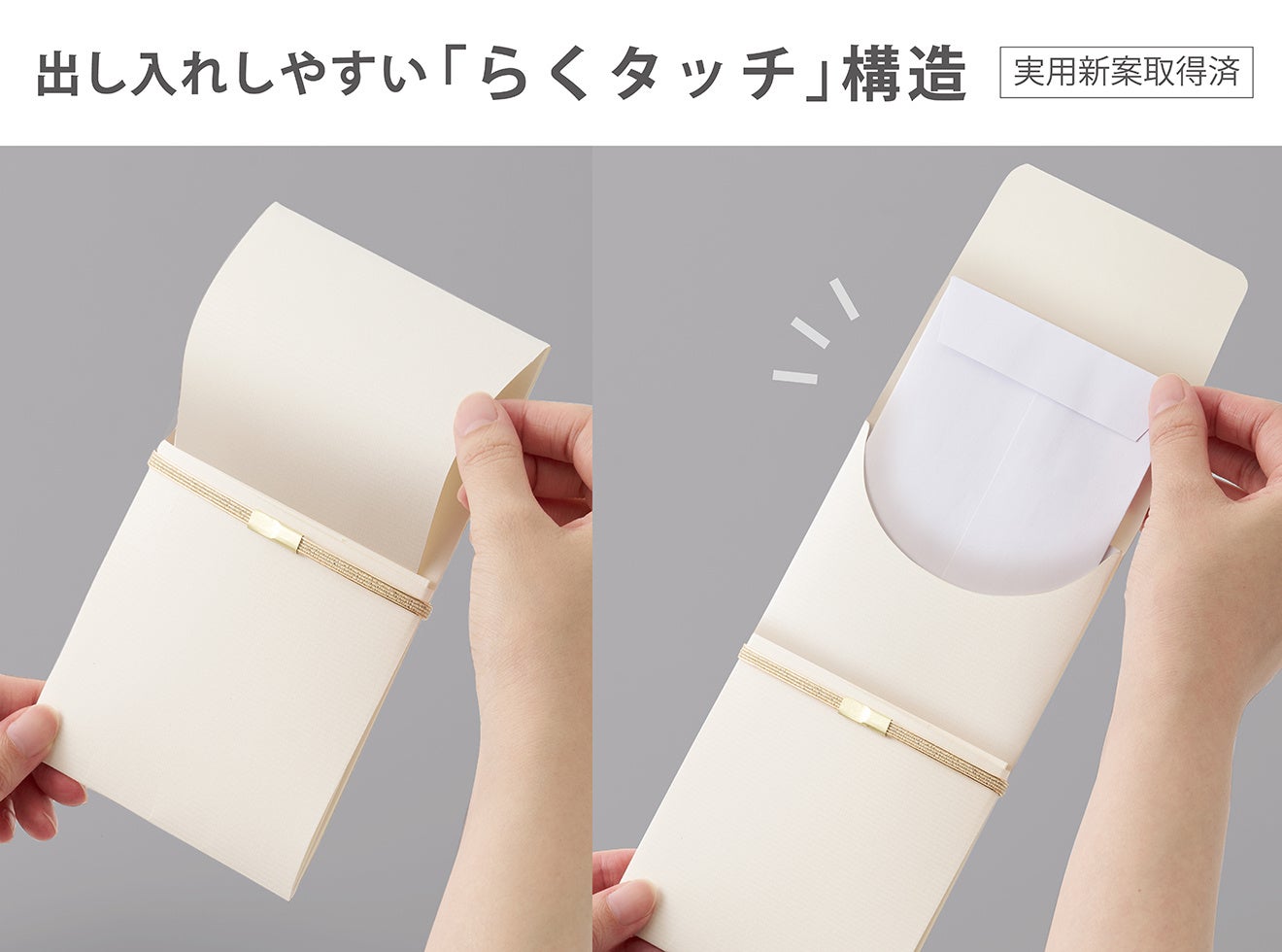 本製品には「らくタッチ」構造(※)を採用しています。封筒のような作りとなっており、本体裏面のフタを開閉するだけで中身を出し入れすることができます。水引飾りを外したり本体の紙を広げたりする手間がないため、祝儀の準備や受け渡しが、よりスマートに行えます。
