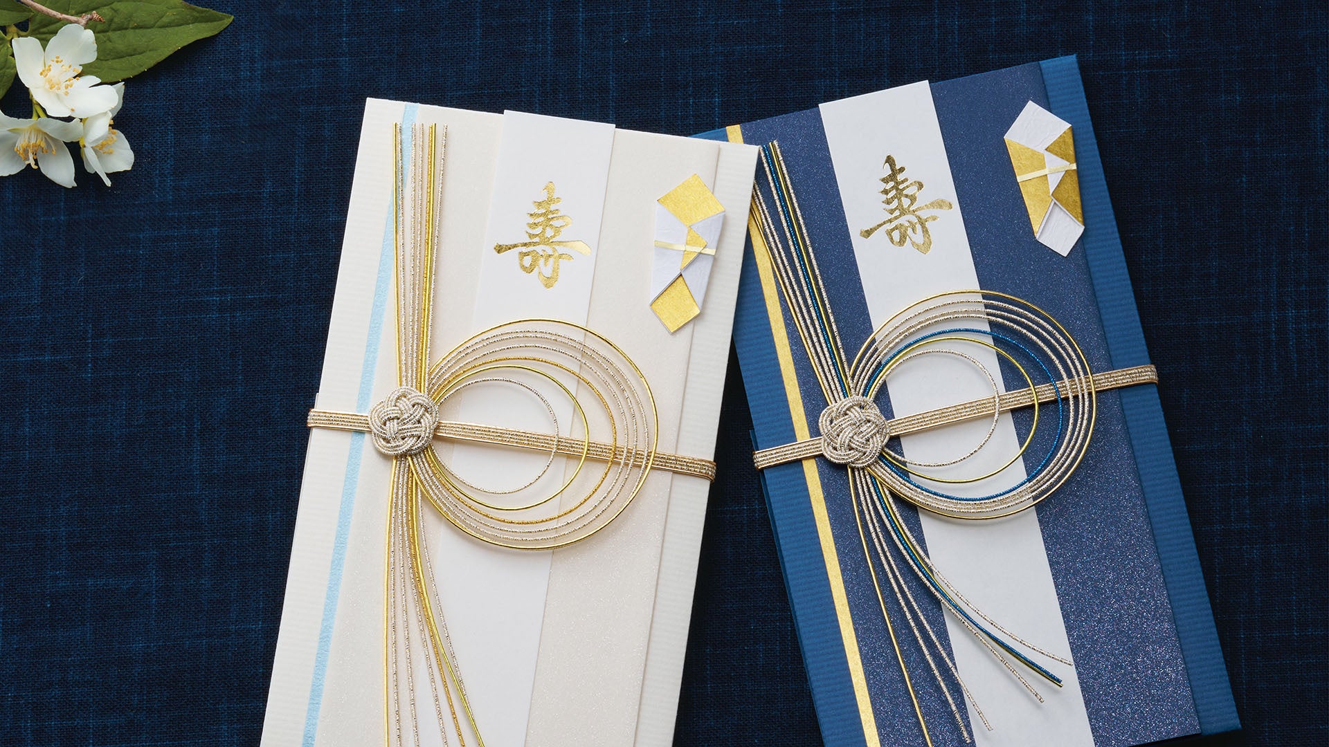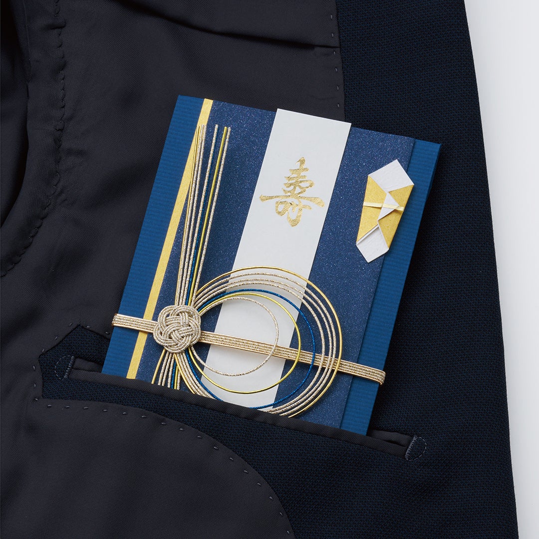 価格:528円(税込)/種類:2種(白・紺)/製品寸法:100×180mm/内容:本体1枚、短冊2枚(壽・無地)、中袋1枚/製品紹介ページ:https://stg-paper.maruai.co.jp/shop/c/c01039918/