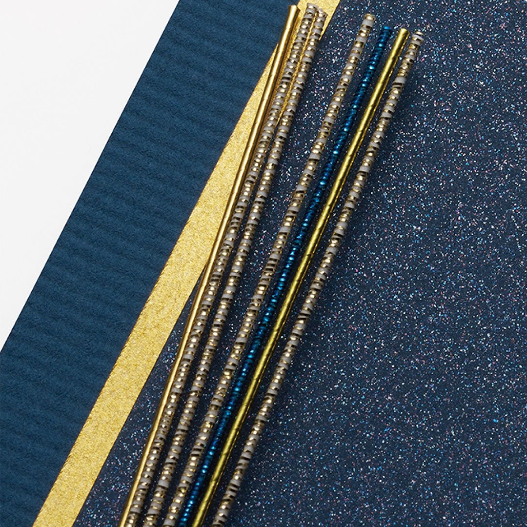 『慶金封』は、二人の門出を祝福する気持ちを表現した婚礼用祝儀袋です。水引飾りには「新たなスタート」や「物事のはじまり」を象徴する“日の出”をかたどった意匠をあしらい、新たな一歩を踏み出す二人を祝福する気持ちを表現しました。本体には縞模様が入った紙や上品に輝くパール紙など、テクスチャーのある素材を組み合わせることで、シンプルながらも洗練された印象に仕上げました。