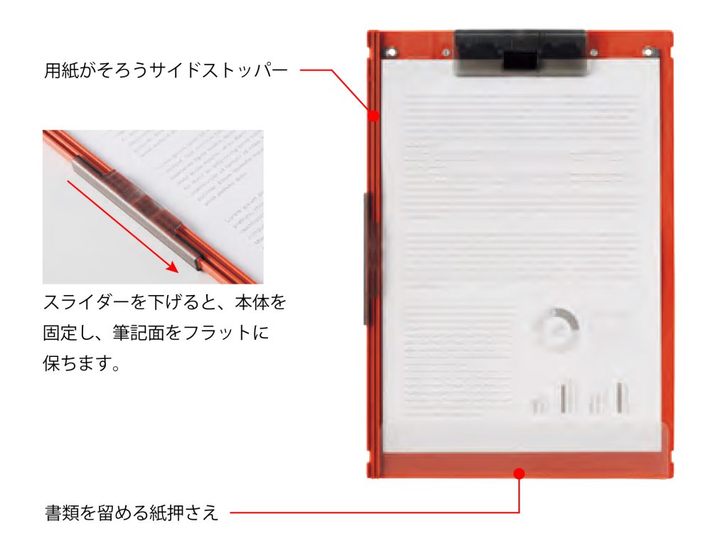 本体がフラットに固定されるので、立ったままでも記入することができます。 | |
