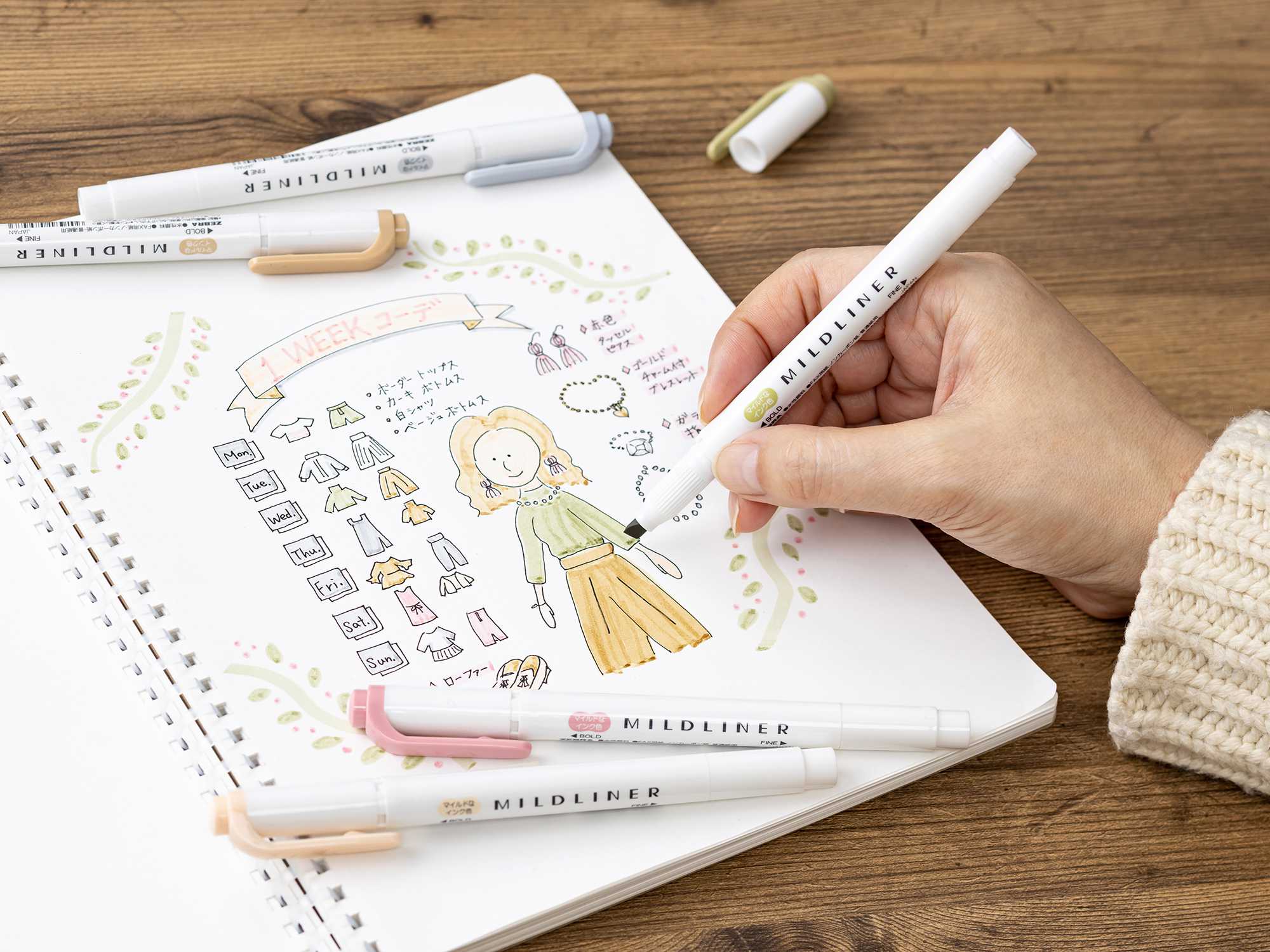 「マイルドライナー」と同じインク色に加え、新色も採用。MILDLINERシリーズを組み合わせて使うことで、文字とデコレーションのトーンをそろえ、可愛らしく仕上げることができます。