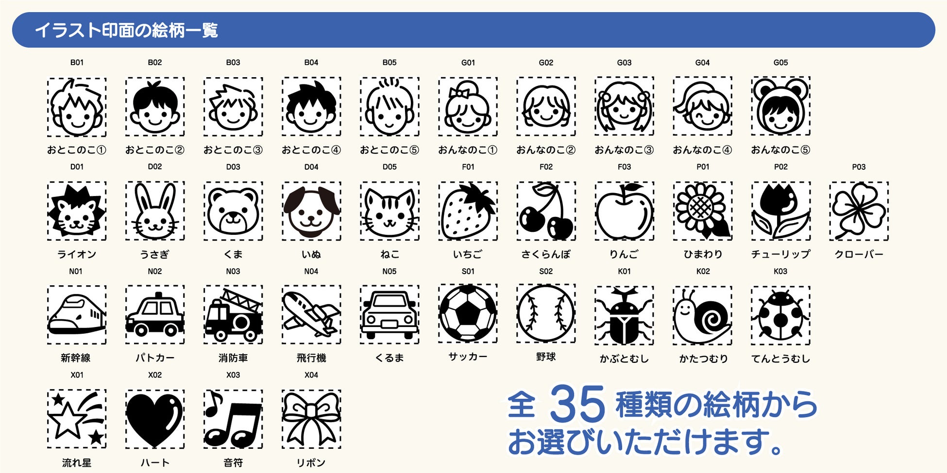 2.5×5mmから10×55mmサイズまで、大小8タイプのゴム印がつくれます。また、正方形(10×10㎜)は、イラスト印面の全35種類の中から絵柄から選べます。