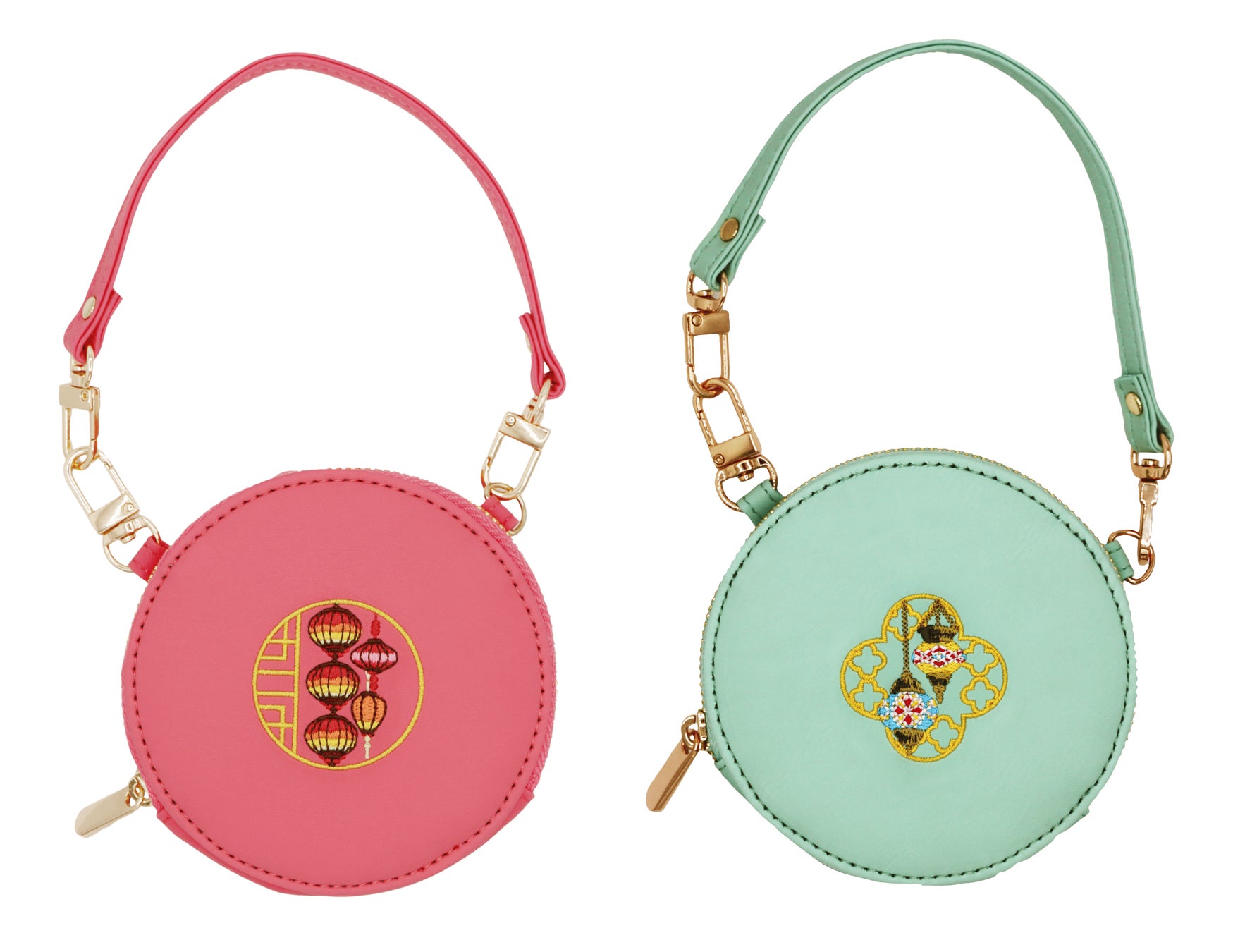 ・コロンと丸い形に、刺繍でランタンのデザインを施した丸型ポーチは、ストラップつきで
