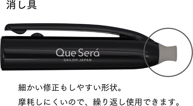 文具メーカー3 社(プラス株式会社、ぺんてる株式会社、セーラー万年筆株式会社)共同開発のインク「Que Será」を搭載した、これまでにない“はがして消せる”ボールペン。