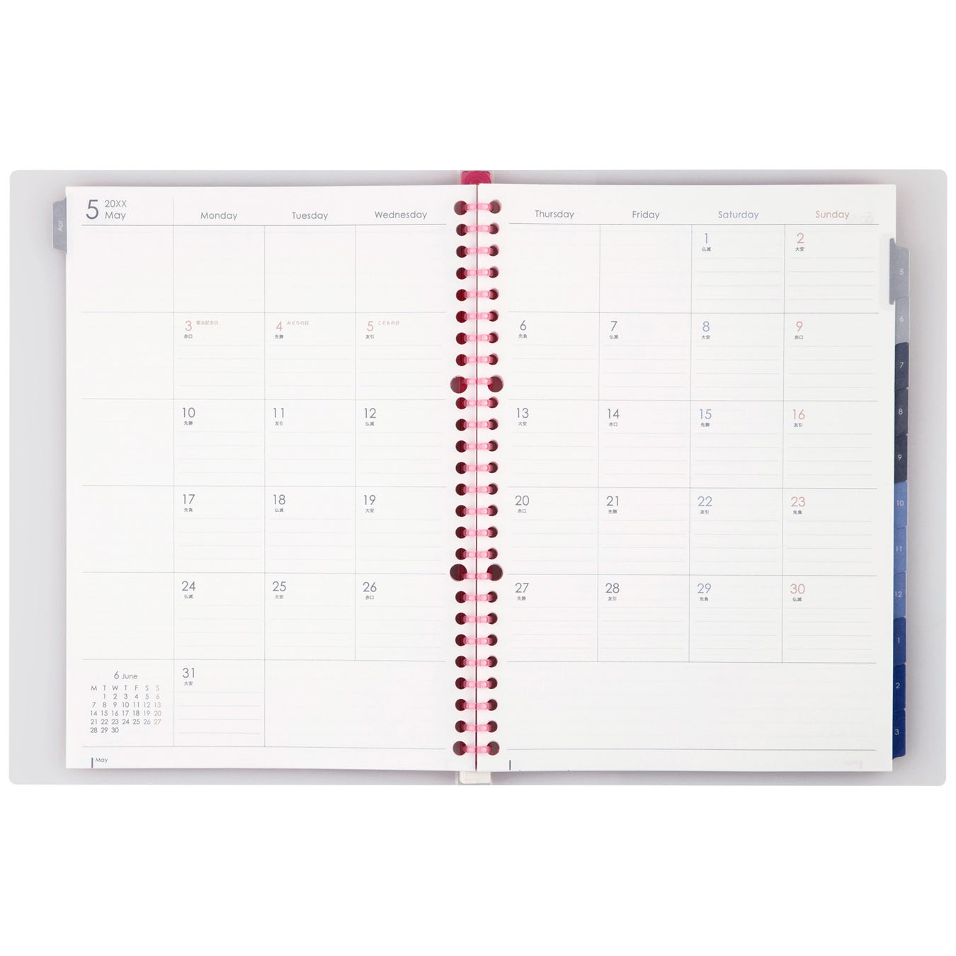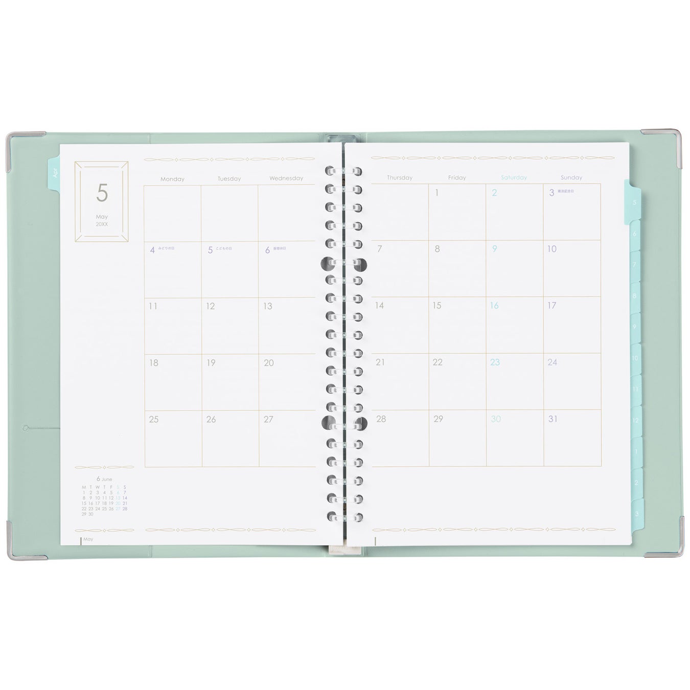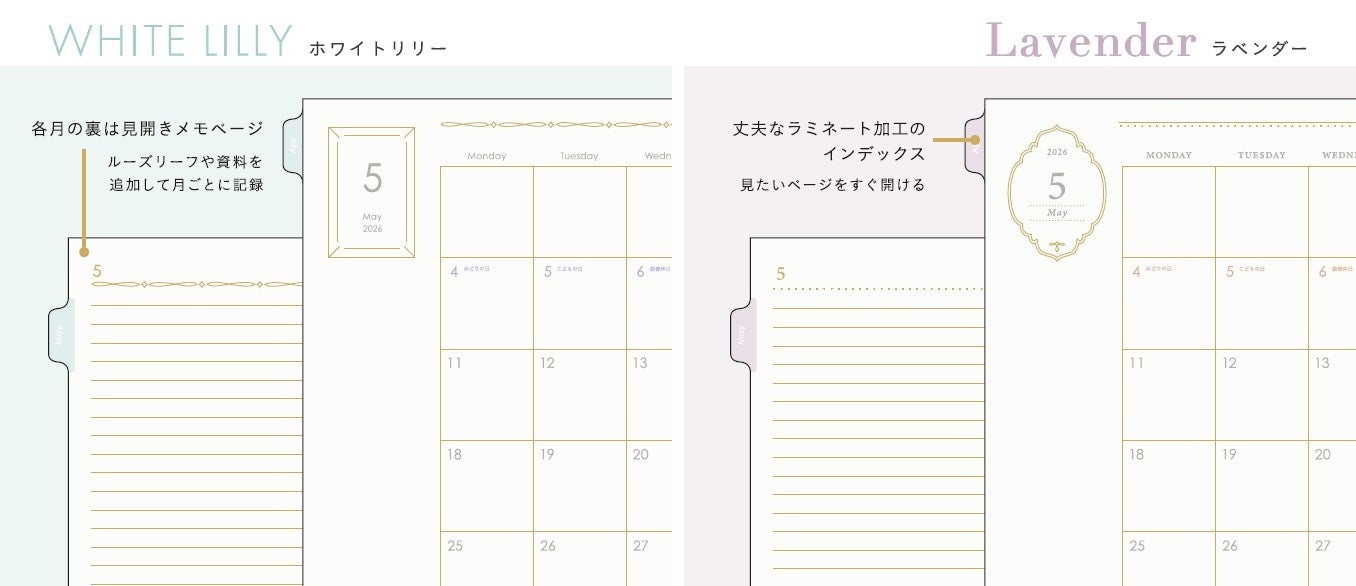 花をテーマにした上品なカラーで罫線には装飾が施されている特別感のあるルーズリーフダイアリーです。見たいページをすぐ開ける、丈夫なラミネート加工のインデックス付。各月の裏は見開きメモページで、ルーズリーフや資料を追加して月毎の記録も可能です。