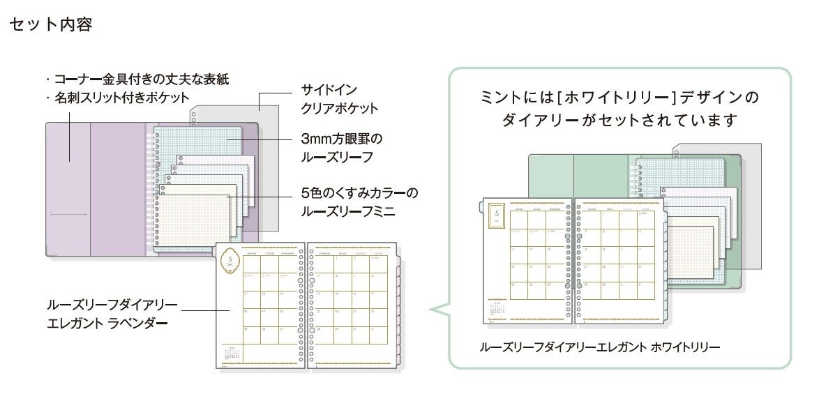 やわらかで落ち着いた色合いのバインダー『ユアンス』と『ルーズリーフダイアリーエレガント』のセットが4月始まり版で新登場!ダイアリー以外に3㎜方眼罫ルーズリーフ、くすみカラールーズリーフミニ、サイドインクリアポケットがセットされていて充実。