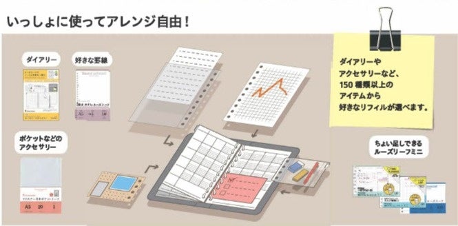 使い方が広がる追加アイテムがたくさん。外側のバインダーも好きなデザインが選べて、