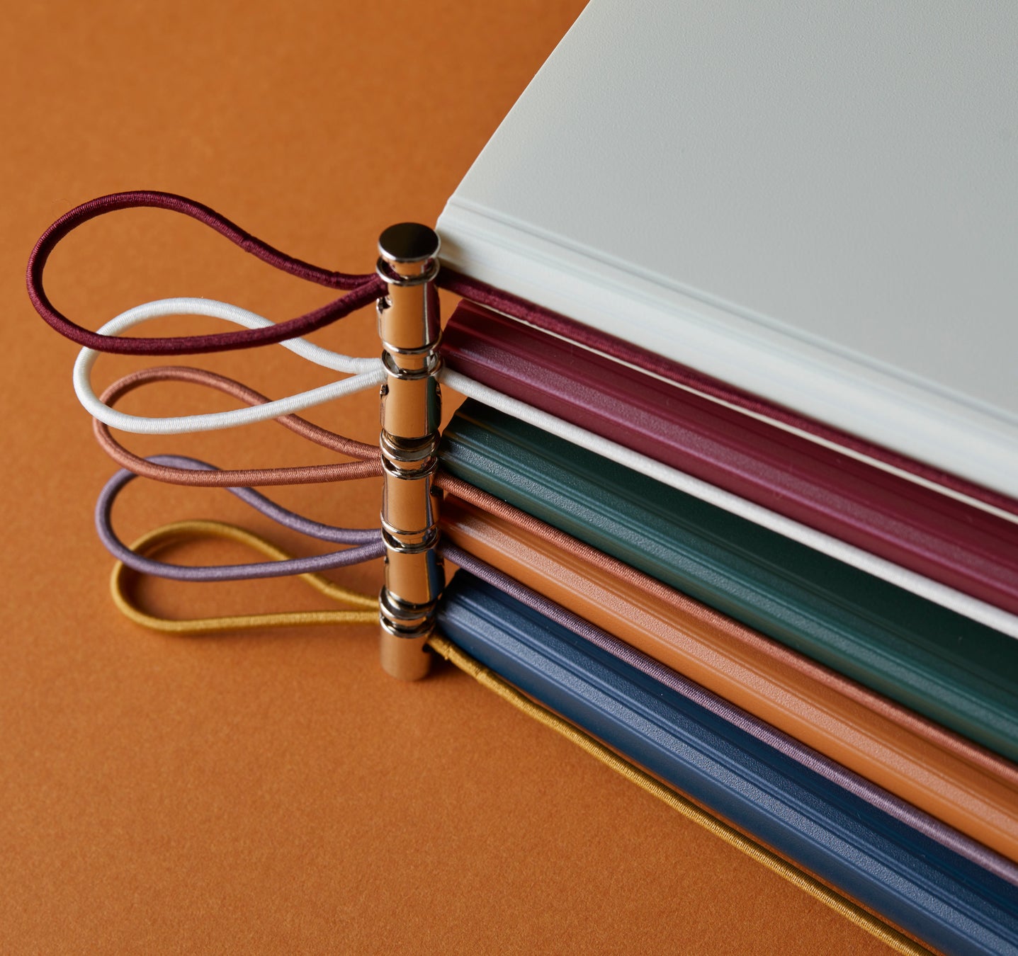 レトロな喫茶店をイメージした、シックで落ち着いた色合いの5色(マルーンレッド、レトロホワイト、ボトルグリーン、アンティークネイビー、ブリックオレンジ)展開です。表紙と丸ゴムの配色を変えたバイカラーデザインも特長です。