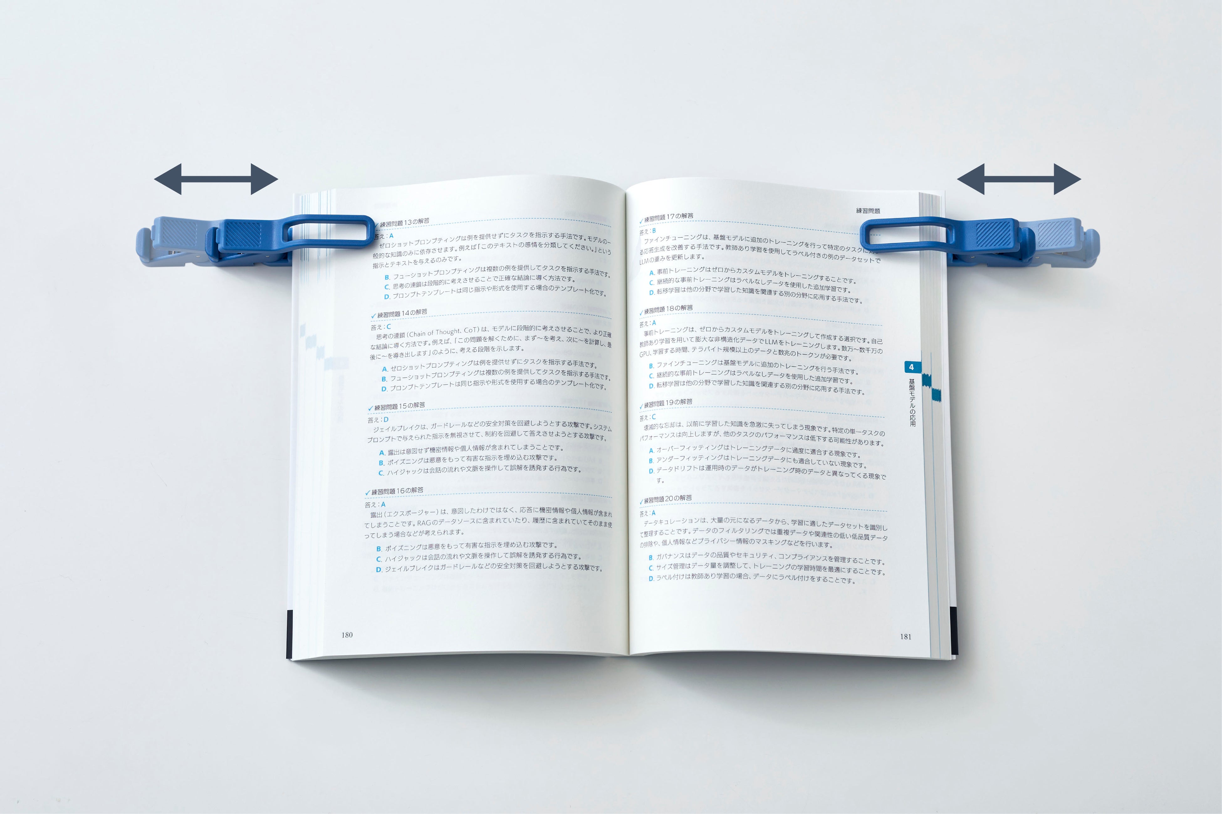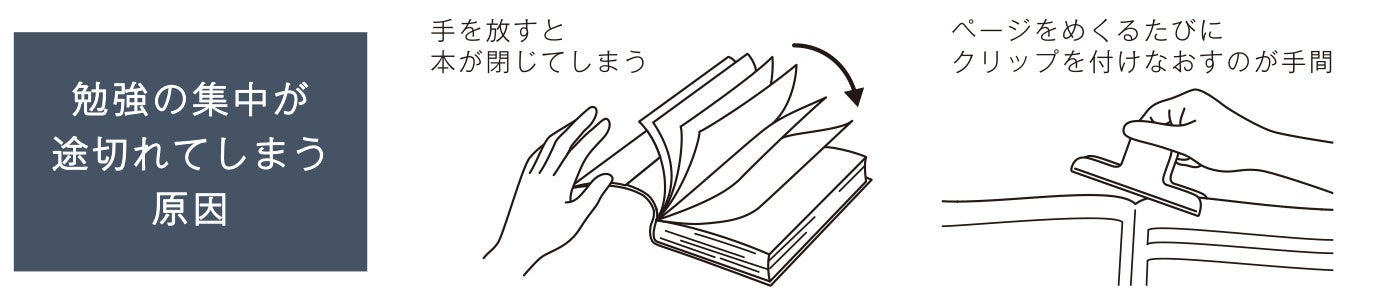 近年、受験勉強の効率化の需要や社会人の学び直しが増えたことから、参考書やテキストを開いたまま固定できるブッククリップの需要が高まっています。しかし、既存のブッククリップには「参考書の始めや終わりなど左右のページ数に差があると固定しにくい」「ページをめくるたびにクリップを付け直すのが手間」「重みで固定するタイプは持ち運びにくい」といった不満がありました。