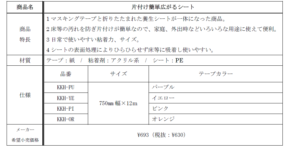 ヤマト株式会社(本社:東京都中央区 社長:長谷川 豊)は、汚れを防止する専用シート「片付け簡単広がるシート」の発売を2月4日(水)より開始し、全国有名文具店、量販店、生活雑貨店、通販等にて随時販売を行います。
