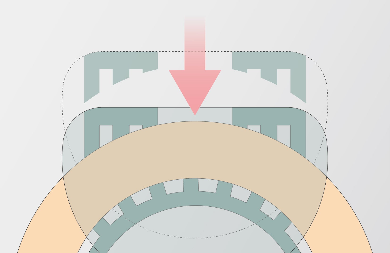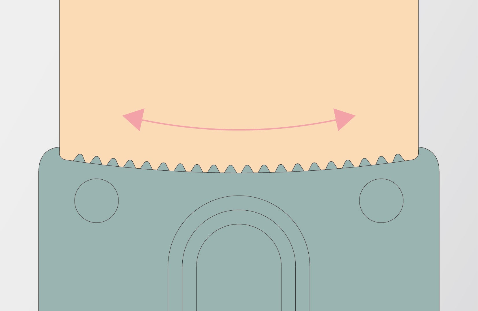 テープの残量にあわせて握る厚みを調整できる本体と、本体内側の立体カーブ形状で、テープの使い始めから終わりまで握りやすさをキープします。また、カット時に本体を握り込むと、内側の凹凸がテープをロックし、狙った位置でしっかりとカットできます。