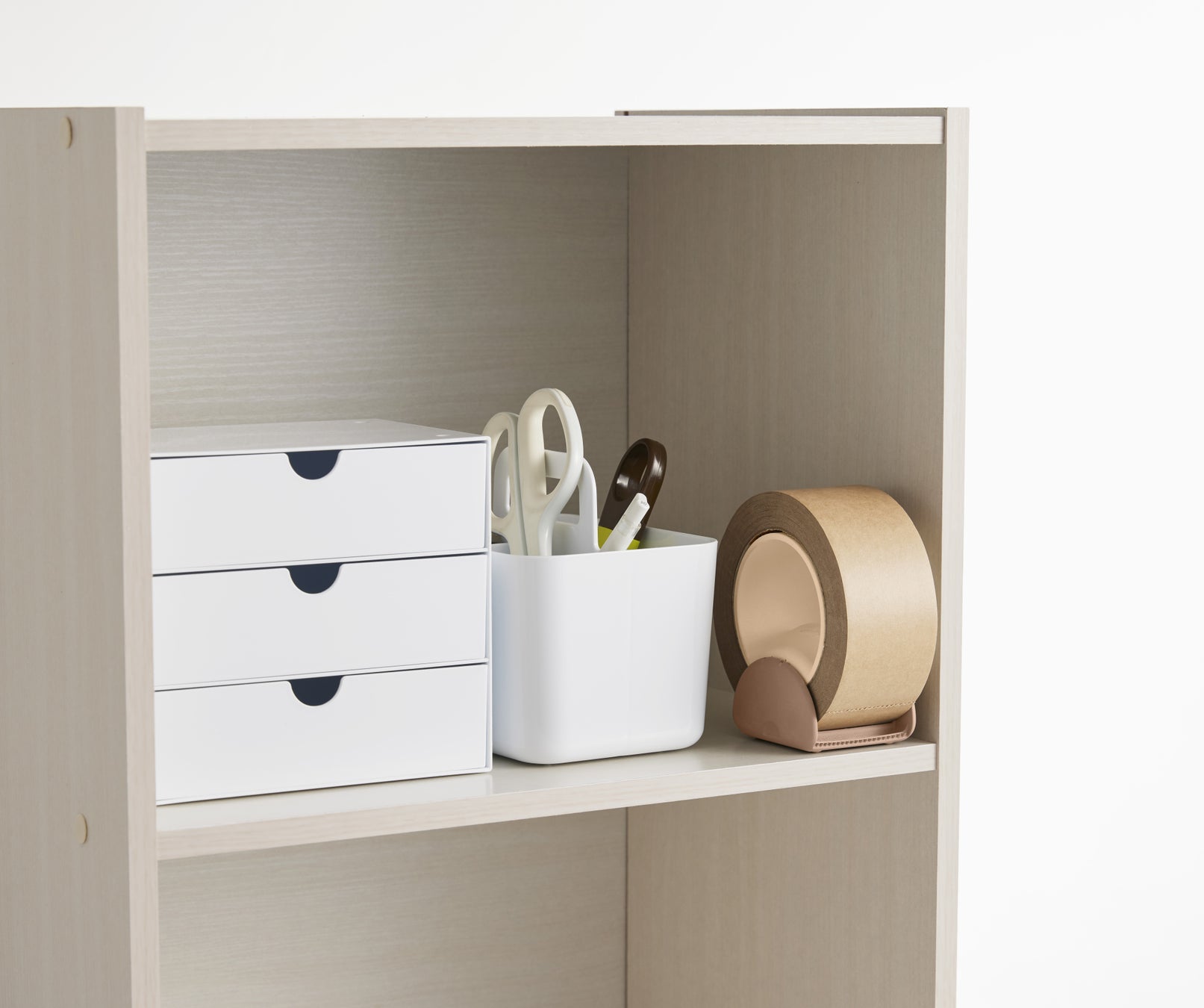 カッター部の形状が台座のような役割を果たし、使わないときには本体を立てて置くことができます。テープが転がる心配がなく、収納ボックスや棚に省スペースですっきり収納。煩わしい“収納問題”も解決です。また側面にホコリやゴミが付かないので、テープをキレイなまま使用することができます。
