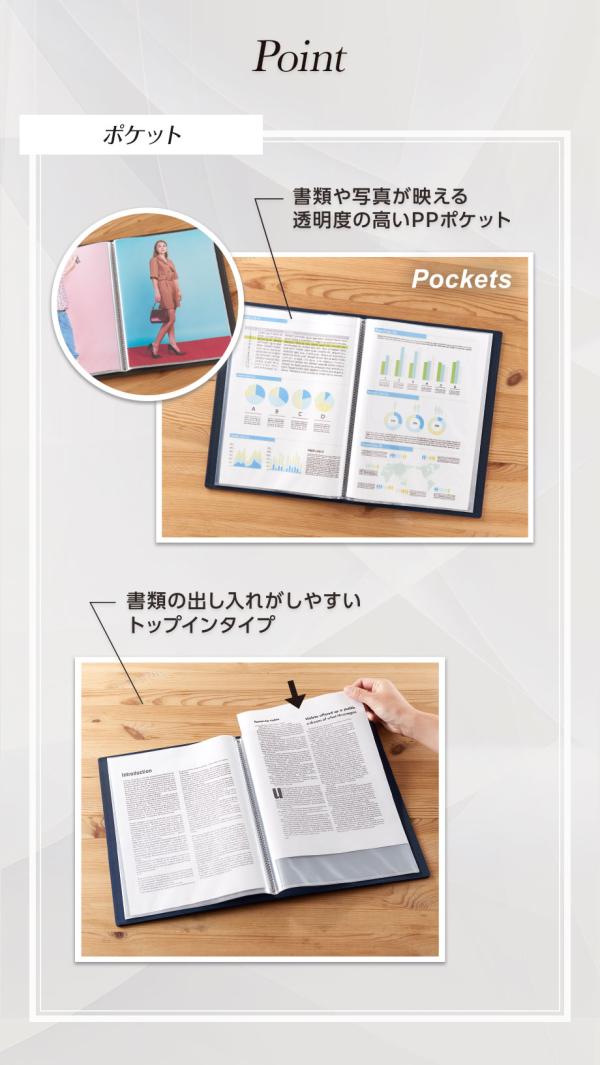●書類や写真が映える透明度の高いPPポケット。書類の出し入れがしやすいトップインタイプです。