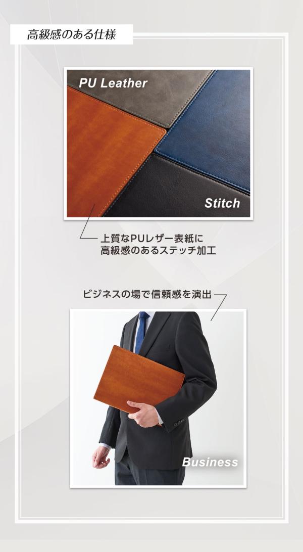●上質なPUレザー表紙に、高級感のあるステッチ加工が施されています。