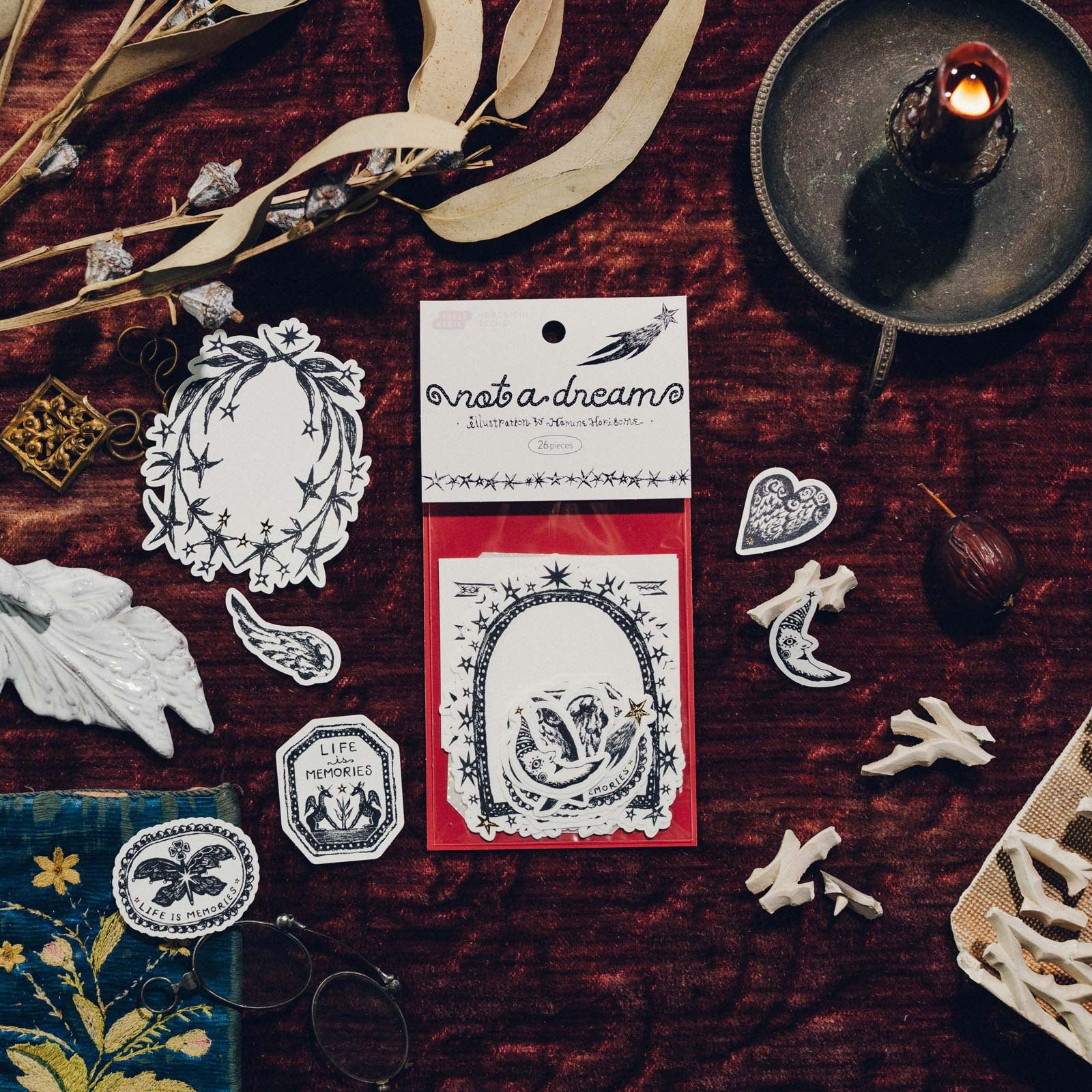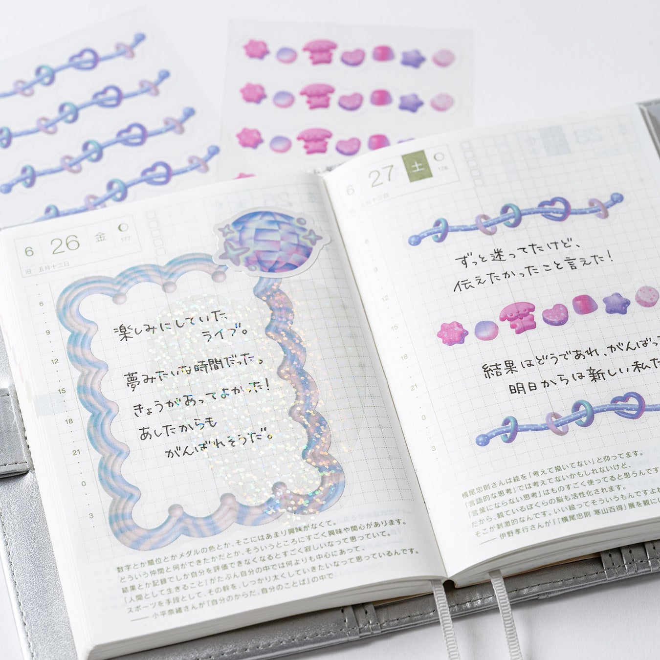 「自分にとって特別な1日」を記録するためのシールが登場!書いたものをユニークな額縁で飾れるフレームシール、自由に組み合わせて使えるラインシール、キラキラのホログラムでその日の思い出を閉じ込める透明シールのほか、「特別な日」をいろどるイラストシールが入った、全26枚のセットです。画家の堀米春寧さんとコラボレーションした『not a dream』、イラストレーターのヌトグランさんとコラボレーションした『Heavenly Sweets』の2種類のデザインをご用意しました。