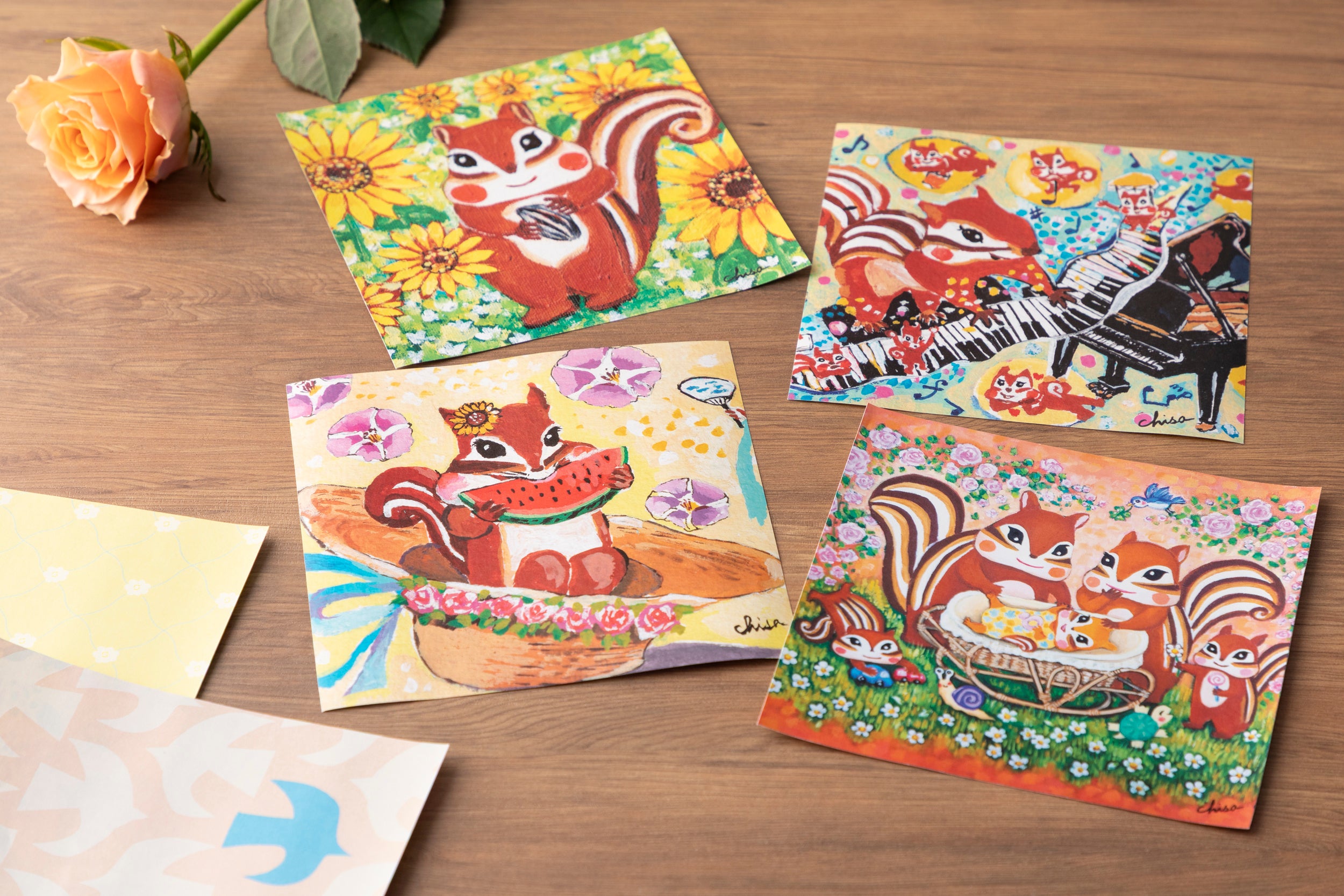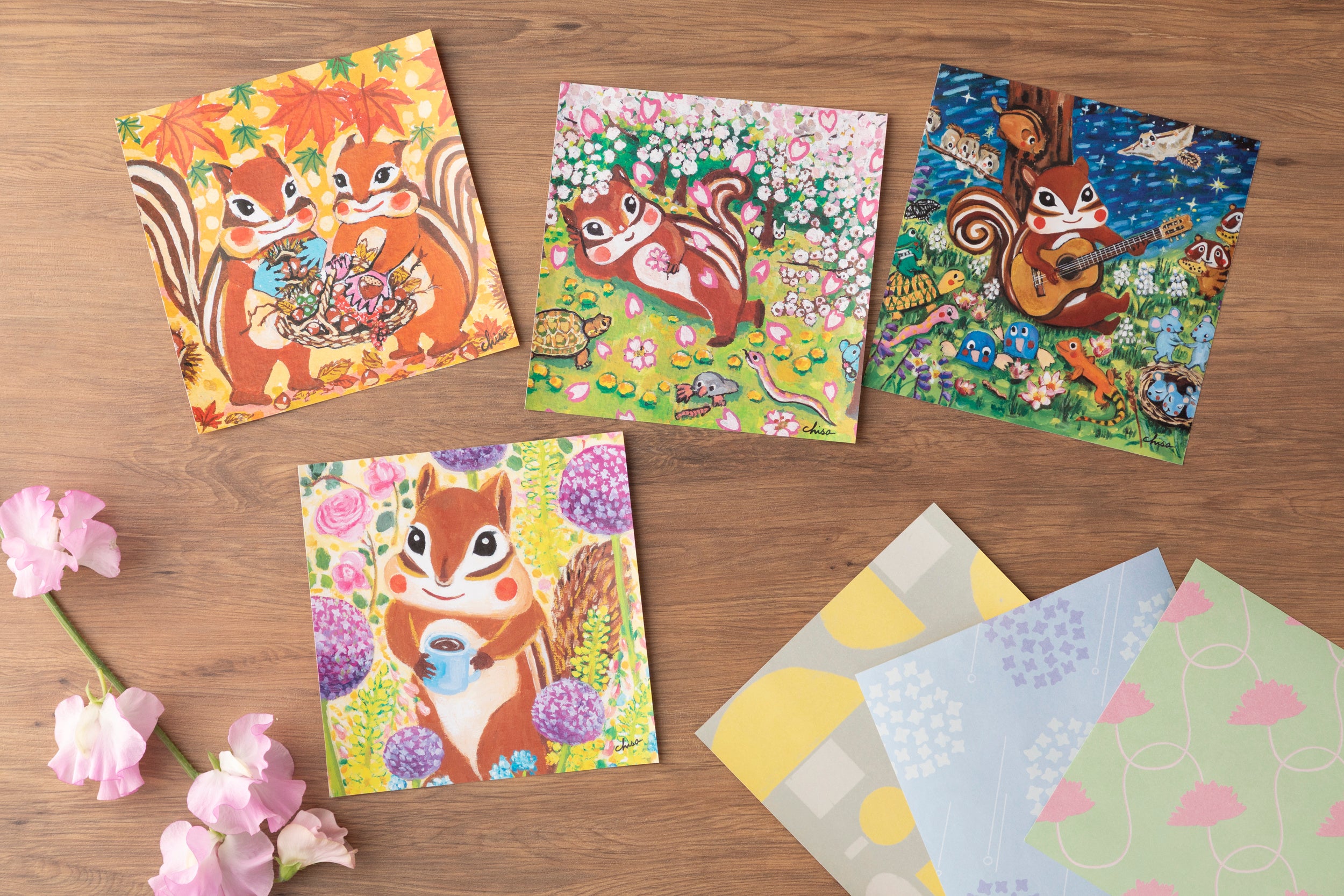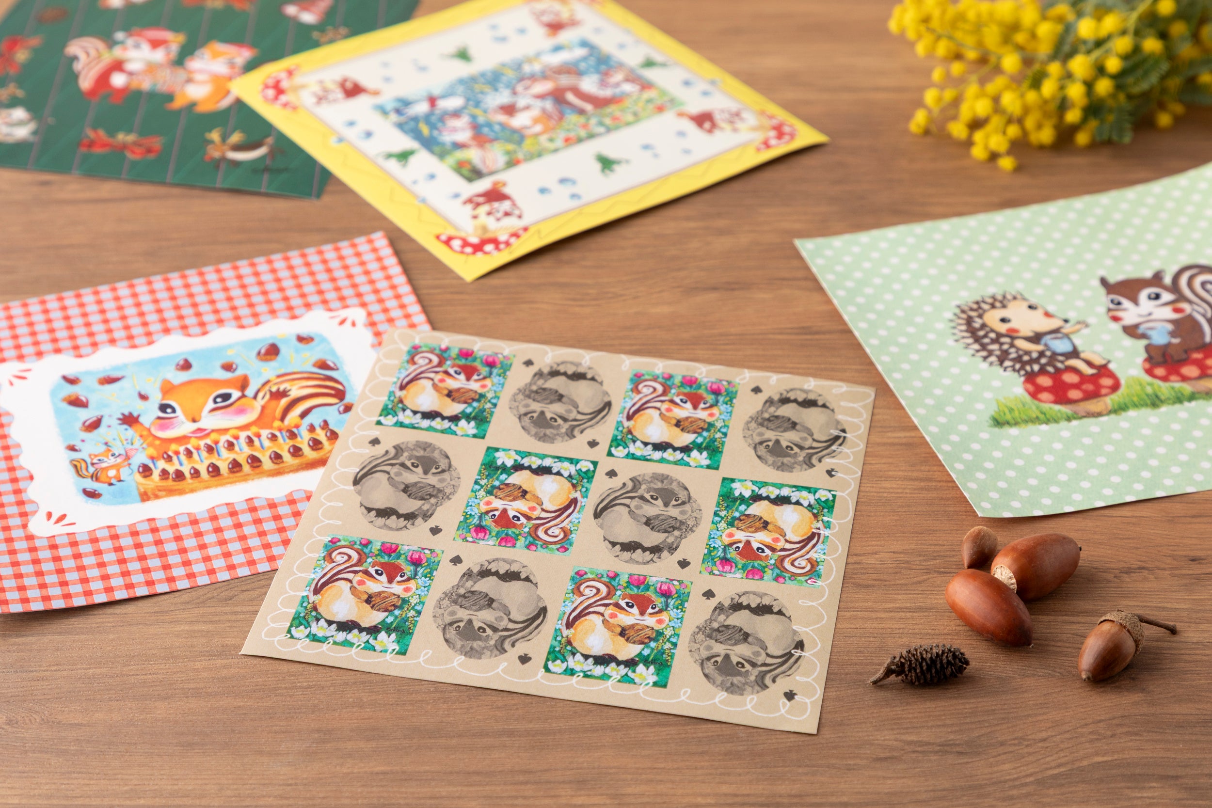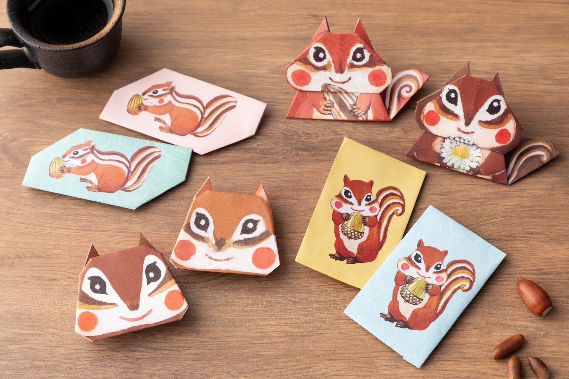 1枚1枚異なる絵柄のおりがみには、四季をまとったリスたちの優しい世界が広がります。大切なひとを思いながら、おりがみに一言添えて、あなたの気持ちをそっと折りたたんでください。