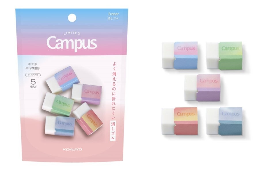 小さくシェアしやすい通常品の約2/3のミニサイズの平行四辺形消しゴム5個をチャック袋にセットしたアイテムです。キャンパスのロゴが"Happy"に変わったシークレット柄がランダムで封入され、見つけた際の小さな喜びや、クラスメイトとの会話のきっかけを生む仕掛けになっています。