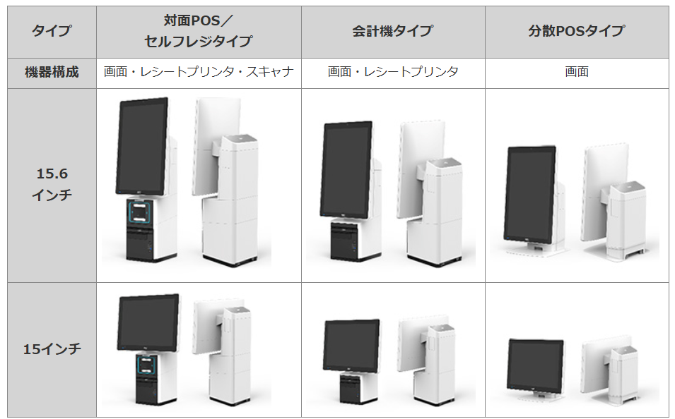 「SS-U1」シリーズは従来のカウンタートップレジ(*1)をリニューアルし、新たに縦画面15.6インチモデルを追加しました。さらに、機器構成の異なる対面POS/セルフレジタイプ、会計機タイプ、分散POSタイプを取り揃えています。
