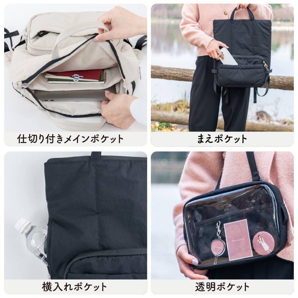 透明ポケットをくるっと裏返せば、シンプルリュックに擬態するバックパック