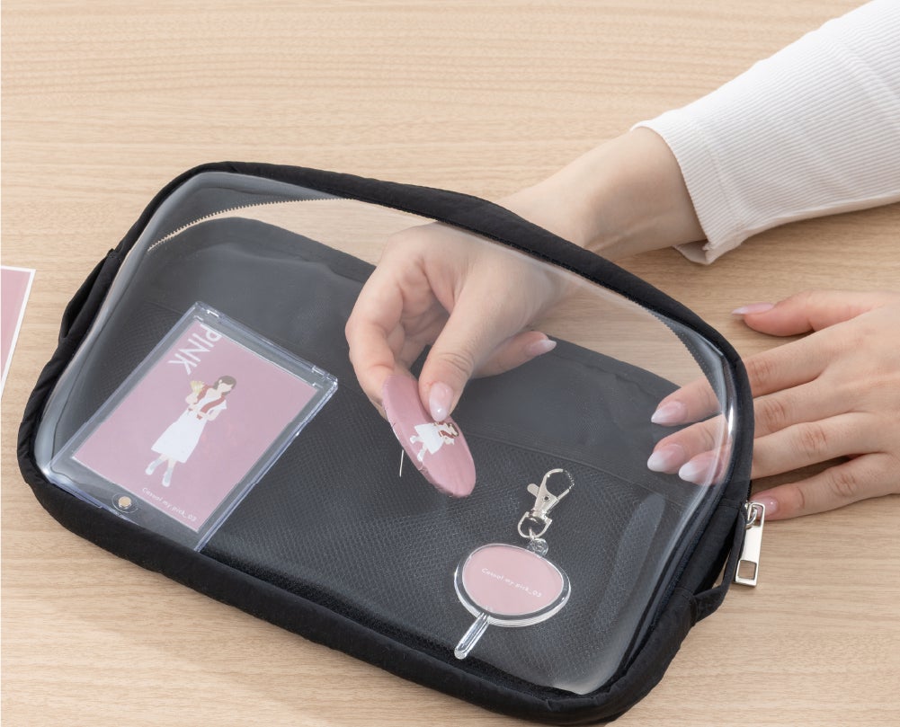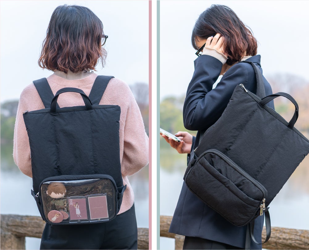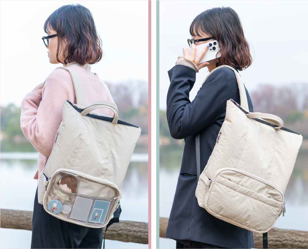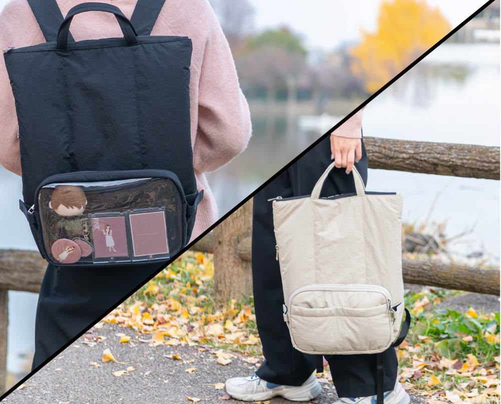 透明ポケット面をくるっと裏返すことで、生地面のシンプルなバックパックに擬態。通勤・通学などのシーンにも自然に溶け込みます。その日の気分やシーンに合わせて、“見せる”も“隠す”も自由自在。日常と推し活を両立できます。カラーはブラックとライトベージュの2色展開です。