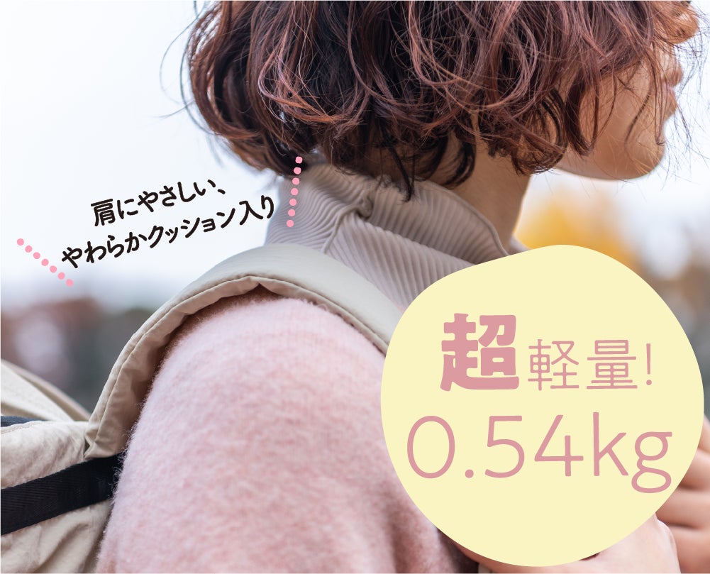 製品重量は約540gと超軽量。クッション入りショルダーベルトで、肩への負担を軽減します。