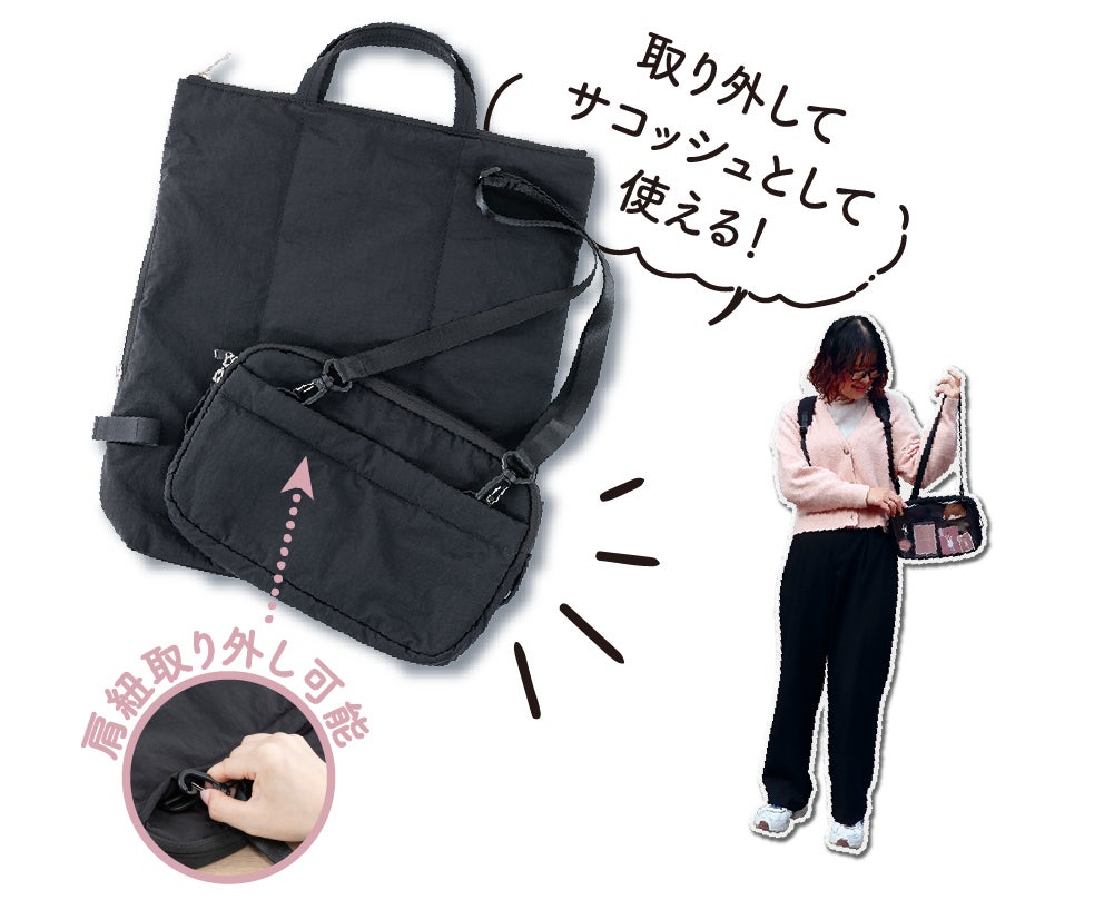 まえポケットは取り外し可能で、サコッシュとして使用できます。ライブやイベント会場など、出し入れの多いシーンに便利です。透明ポケット面と生地ポケット面の2種類を使い分けて、チケットやトレカなど小物をを整理しやすく、イベントでも扱いやすい仕様です。サコッシュ用の肩紐は取り外し可能。不要な際は外してポケットに収納できます。