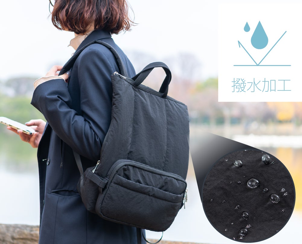 開口部の両側に持ち手を備えており、背負うだけでなく手持ちにも対応。電車内や屋内など背負いにくいシーンでもスムーズに持ち替えができます。