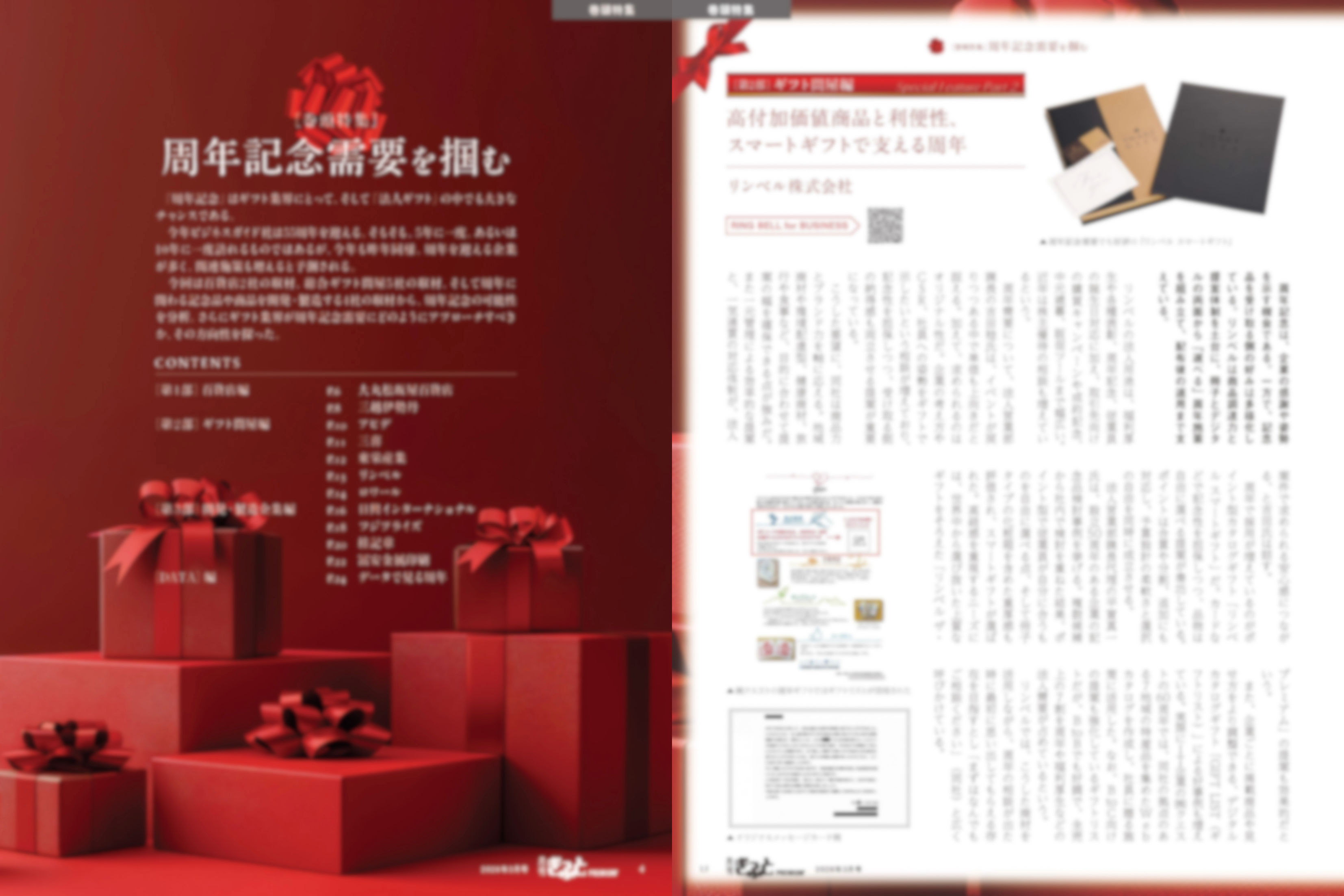 巻頭では「周年記念需要を掴む」を展開。帝国データバンクの調査(※3)で今年10年刻みの節目となる「周年」を迎える企業が14万5000社を超えることからも、今年は周年記念の企業活動が特に多く見込まれます。企業ギフトの分野において、この売上拡大チャンスをどう掴むべきか、百貨店やギフト問屋、そして記念品メーカーに取材周年記念の潮流と成功則を分析しました。