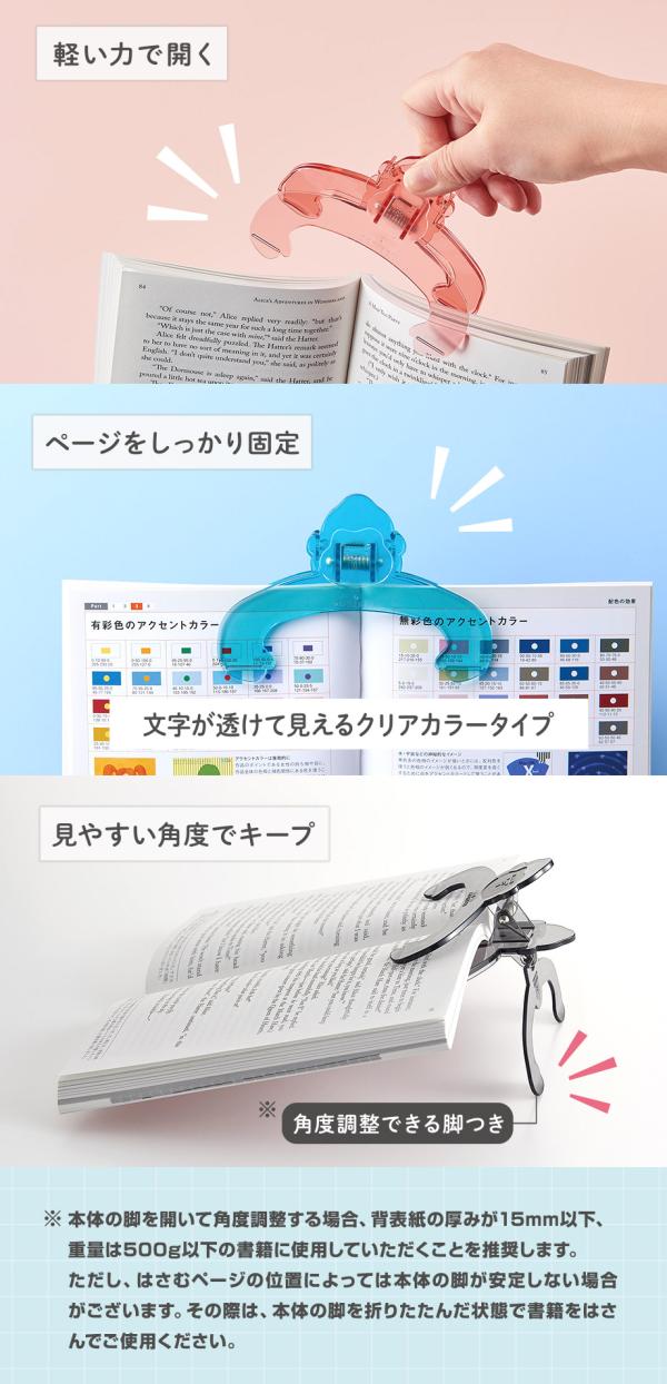 ただし、はさむページの位置によっては本体の脚が安定しない場合がございます。その際は、本体の脚を折りたたんだ状態で書籍をはさんでご使用ください。