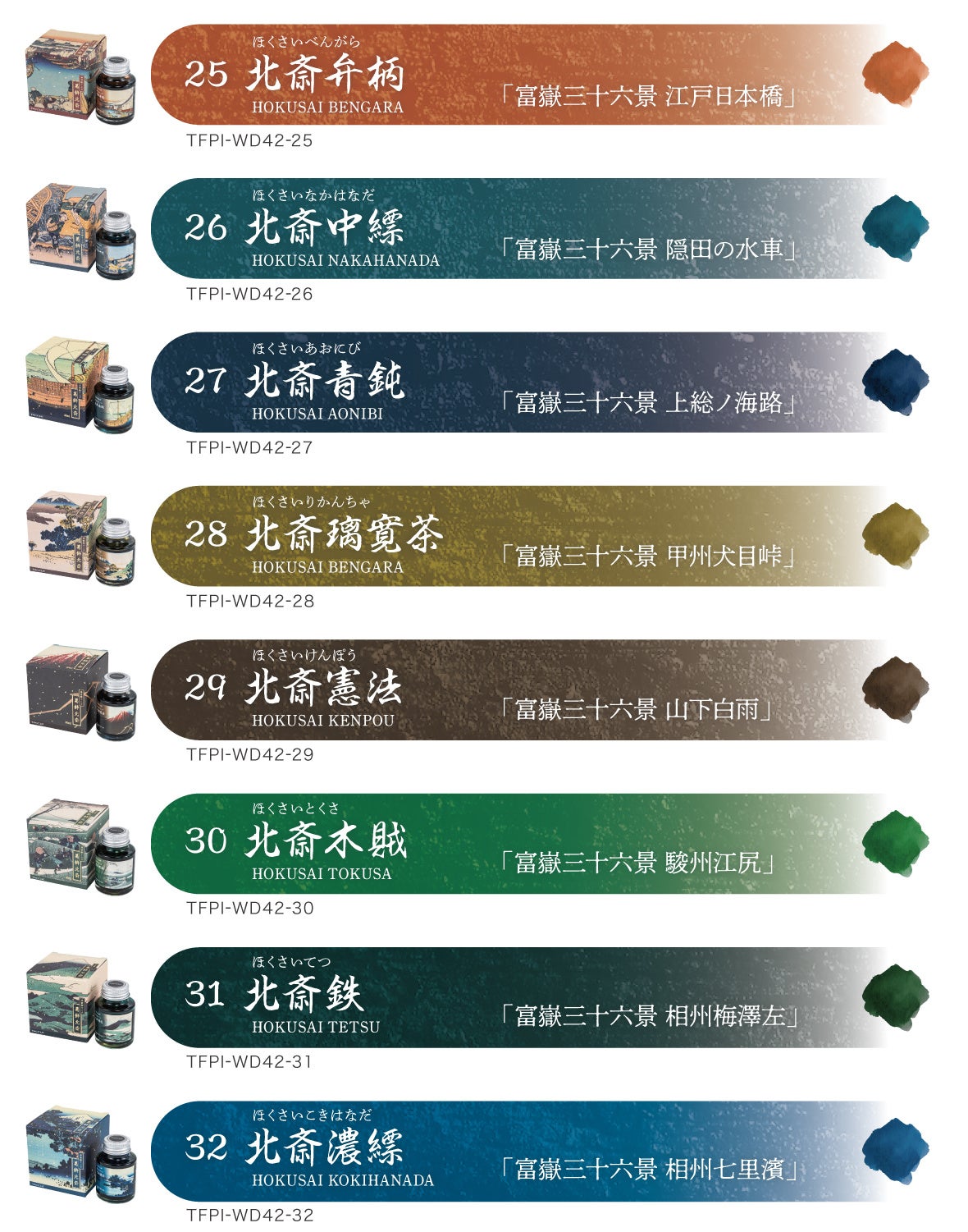 (25)北斎弁柄 / (26)北斎中縹 / (27)北斎青鈍 / (28)北斎璃寛茶 / (29)北斎憲法 / (30)北斎木賊 / (31)北斎鉄 / (32)北斎濃縹