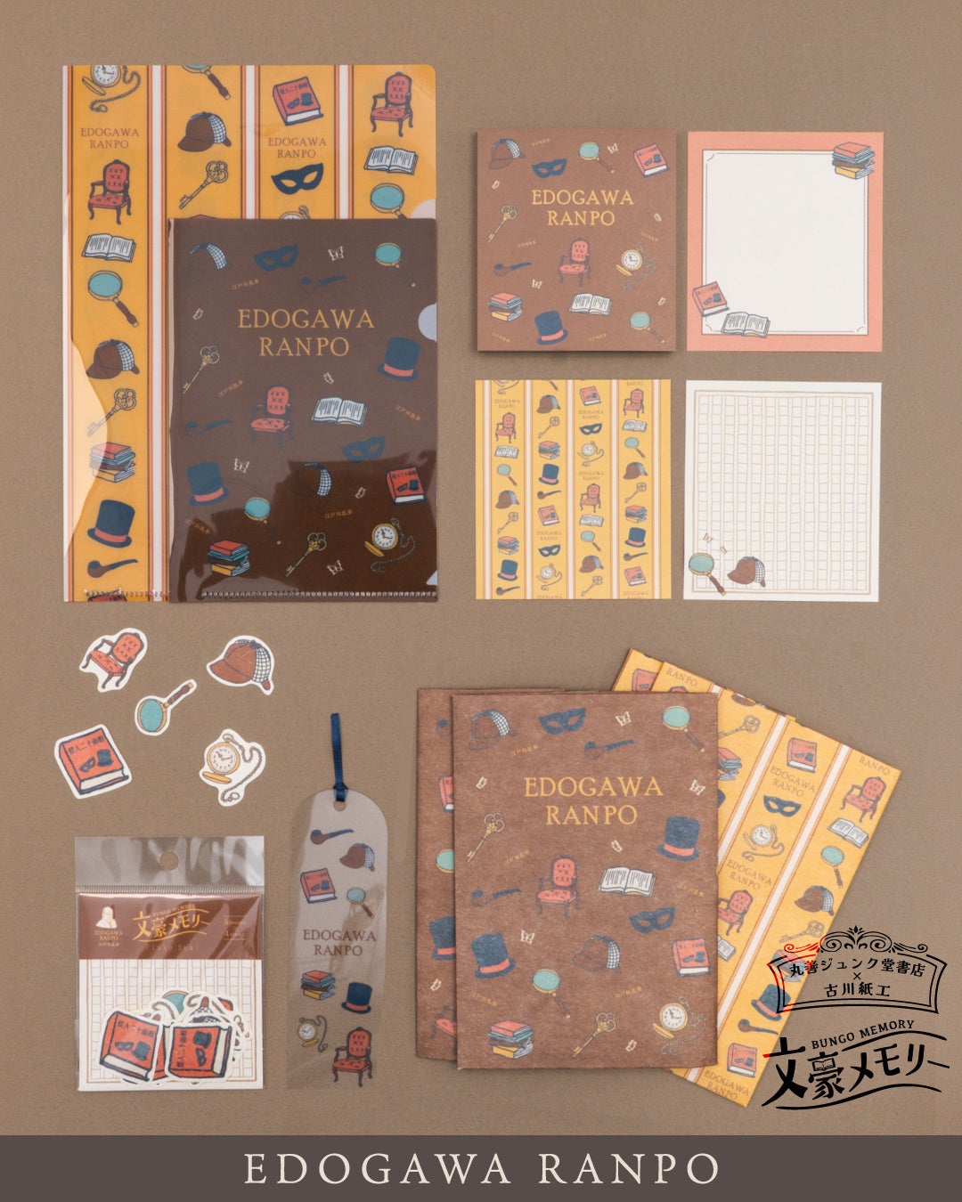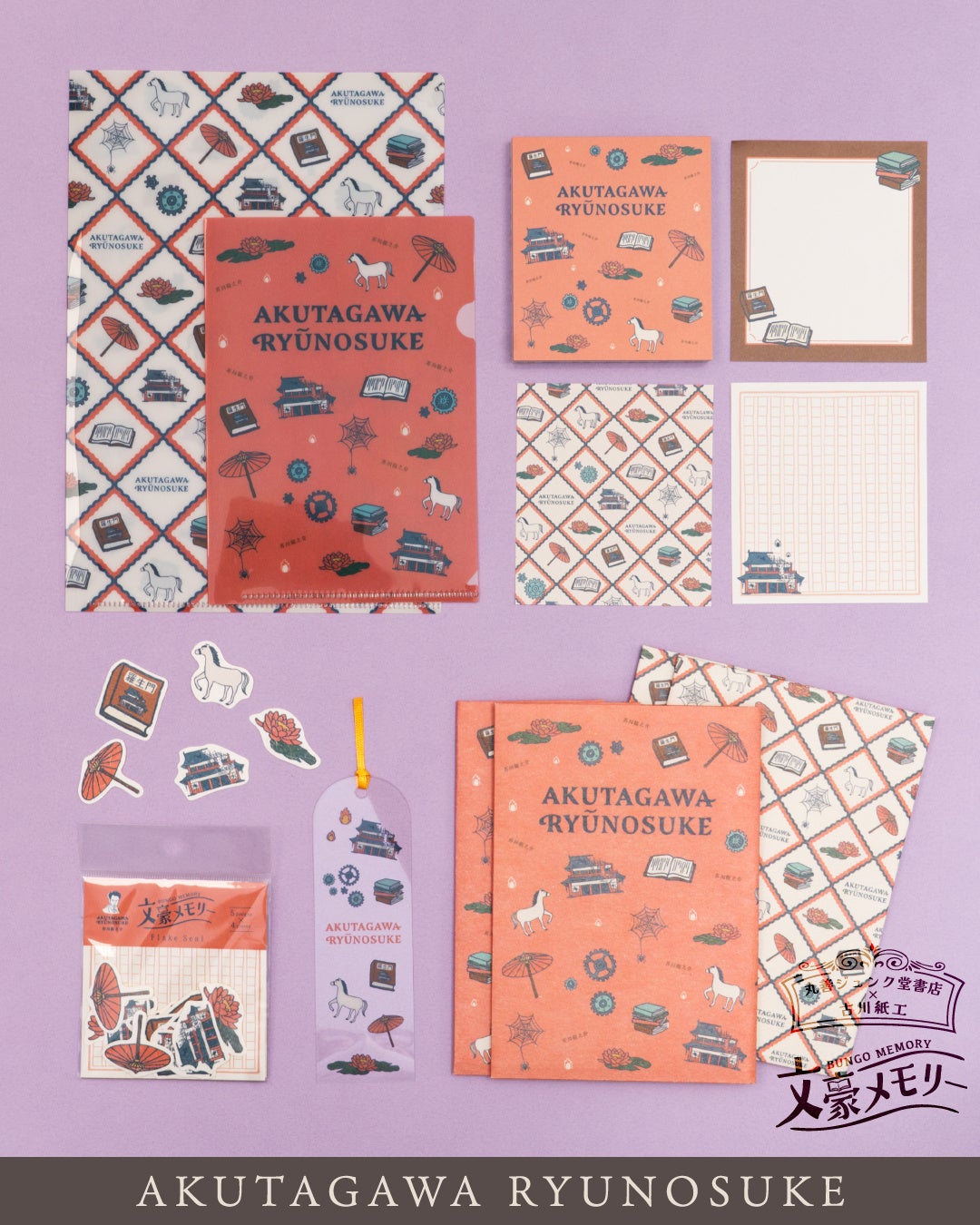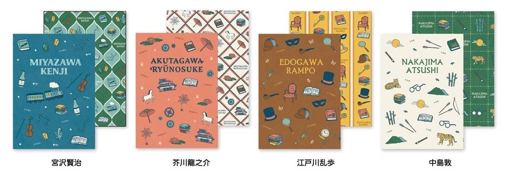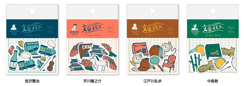 今回は「文豪」にスポットを当てた「文豪メモリー」シリーズの第2弾として、A5/A6クリアファイルセット、メモパッド、フレークシール、クリアブックマーカー、美濃和紙ブックカバーの5アイテムを、それぞれ宮沢賢治、芥川龍之介、江戸川乱歩、中島敦という文豪4人の作品をモチーフにしたデザインで発売いたします。