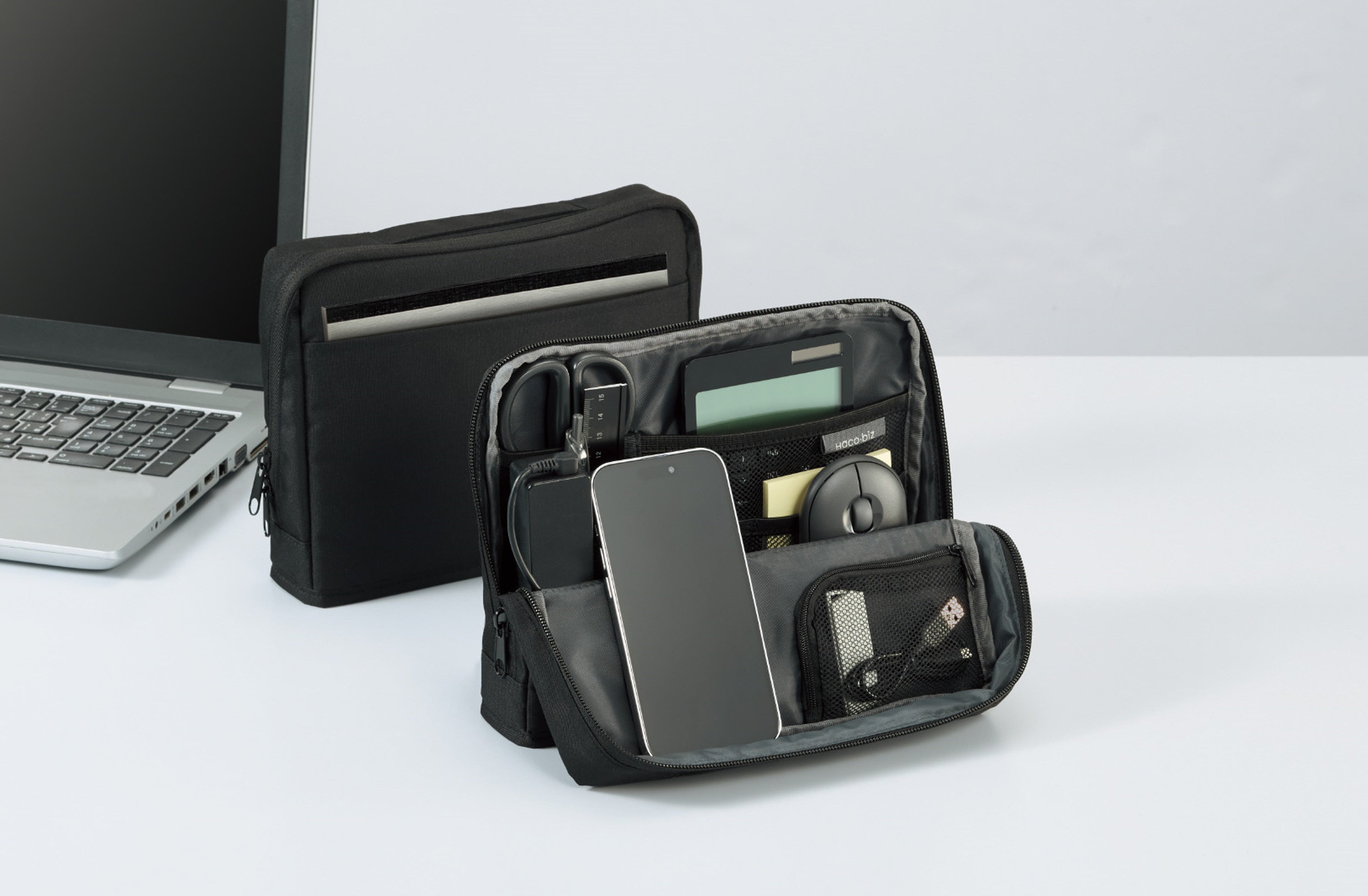 マウスやACアダプターなどの大きめのガジェット類を収容できるスペースと、ペンやイヤホンなどの文具や小物類を整理しやすい6つのポケットや仕切りを備えているため、より収容力がアップしました、また、ファスナーを開けるだけで開口部が前方に広がって自立する構造のため、必要なものをスピーディーに取り出すことができます。フリーアドレス環境で働くオフィスワーカーの仕事効率の向上をサポートします。